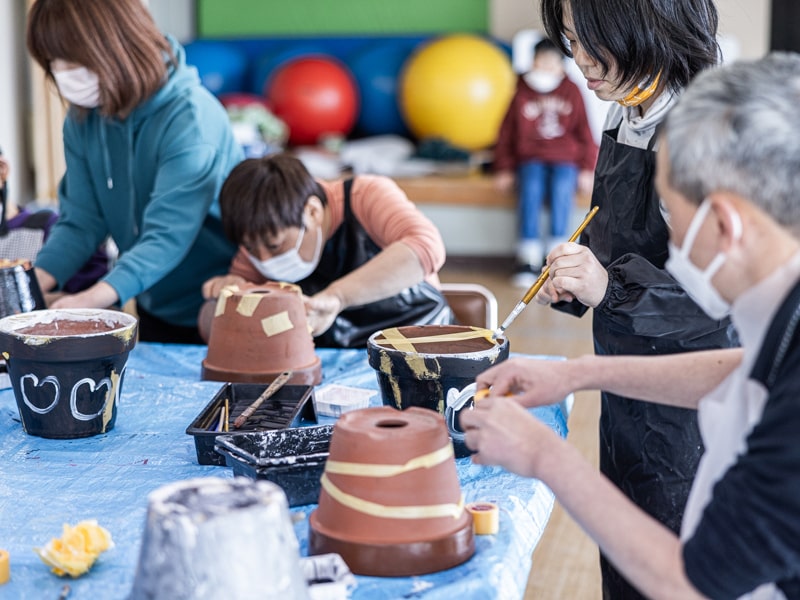 リハビリや表現活動の支援として定期的にワークショップを開催しています。利用者さんの個性を引き出し、自主的な作品づくりのきっかけにもなっています。
