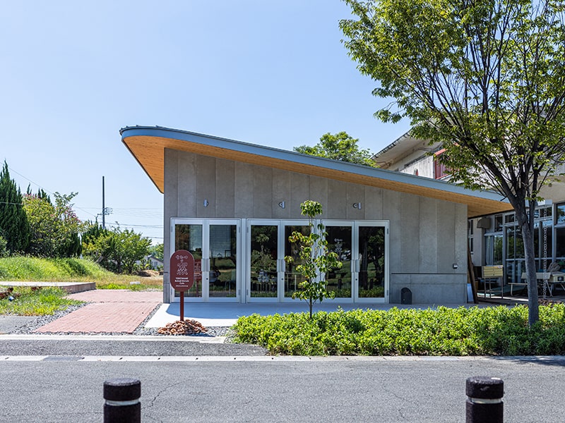 かつて保育園だった施設を一部リフォームした施設で、丸窓やガラスタイル、レンガ色の屋根が特徴の建物です。